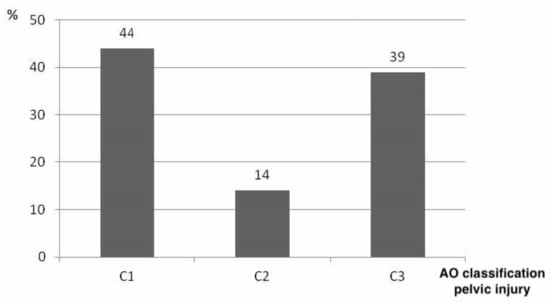 Based on our postmortem CT scans, pelvic ring injuries were classified according to AO. Type C pelvic injuries were the most common in the studied population, and their distribution is shown in Figure 6.
