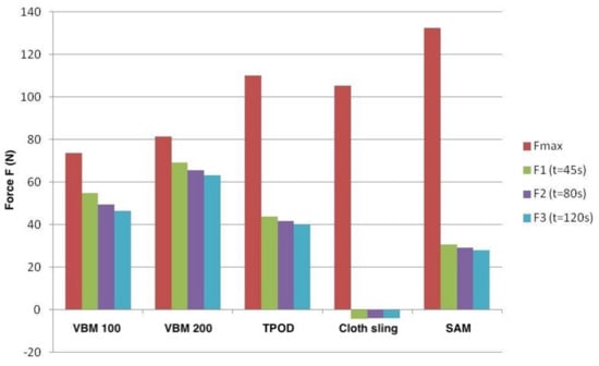 As can be seen from the data in Table 3 and Figure 7, the forces generated by T-POD® and SAM Sling® were only initially the greatest and then quickly decreased. The pneumatic sling VBM®, on the other hand, was able to maintain the initially generated forces over a longer period of time. This could be an explanation for the better radiological reduction results.