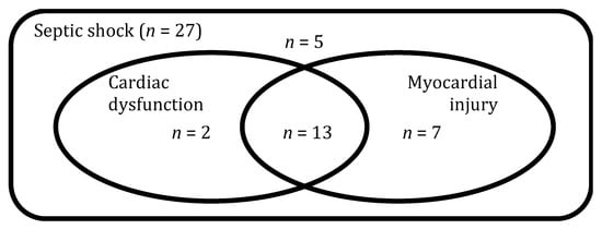Septic cardiomyopathy phenotypes. Venn diagram depicting the number of patients with myocardial injury (hscTnT > 14 ng/L) and cardiac dysfunction (LVEF < 50% or cardiac dysfunction requiring treatment with inotropes). For more details, please refer to Materials and Methods. n—number of patients.