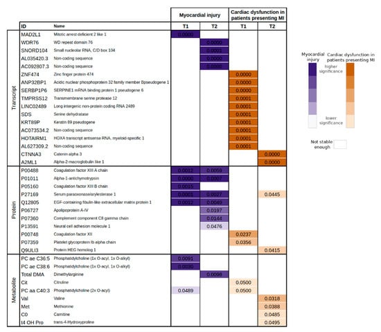 One-way ANOVA for the biomarkers related to myocardial injury in the whole cohort (MI: nT1 = 20 and nT2 = 19—not MI: nT1 = 7 and nT2 = 8), and to cardiac dysfunction in patients presenting myocardial injury (MI and CD: nT1 = 13 and nT2 = 9—MI and not CD: nT1 = 7 and nT2 = 10). The significance of each biomarker is interpreted by means of its p-value, where dark colours stand for higher significance (p-value < 1 × 10−3) and light colours for lower significance (max p-value 0.05). Blank cells represent biomarkers considered not stable enough in the FS for the specific time point and symptomatology.