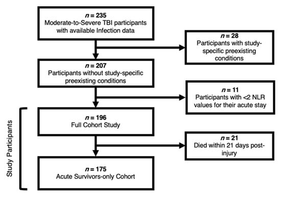 Figure 1 summarizes data availability in a study cohort selection diagram. Additionally, this study specifically required the availability of at least two NLR data-points and infection data (n = 196) over the first three weeks post-injury, available through the University of Pittsburgh Medical Center (UPMC) system’s electronic medical records (EMR). For analysis purposes, we used the full cohort (n = 196) of individuals, that included a subset who died within 21 days of the injury, and an acute-care-survivors cohort (n = 175), which excluded those who died within 21 days of injury. The Glasgow Outcome Scale (GOS) was required for outcome analyses, which was obtained through follow-up participant interviews six months post-injury.