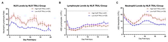 Daily Mean Levels by NLR TRAJ of (A) NLR, (B) ABS Lymphocyte, and (C) ABS Neutrophil Levels.