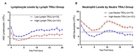 Group-based trajectory analysis was also used to delineate two trajectory groups, a low TRAJ group and a high TRAJ group, for ABS lymphocytes and ABS neutrophils (Figure 3). For Figure 3 and Figure 2B,C, the dashed lines represent the normal clinical range as defined by UPMC clinical laboratory for ABS lymphocytes: 0.8–3.65 109/L and ABS neutrophils: 2.24–7.68 109/L. The optimal fits for both ABS lymphocyte TRAJ groups were a polynomial order of four, while the optimal fits for both ABS neutrophil TRAJ groups were also a polynomial order of four. Posterior probabilities were >0.9 for both TRAJ groups generated for ABS lymphocytes and ABS neutrophils. Concordance between NLR TRAJ vs. ABS lymphocyte TRAJ was significant (χ2 = 39.80, p < 0.0001), as was concordance between NLR TRAJ vs. ABS neutrophil TRAJ (χ2 = 37.02, p < 0.0001). However, concordance between ABS lymphocyte and ABS neutrophil TRAJ group membership was highly non-significant (χ2 = 0.0083, p = 0.927). The low ABS lymphocyte TRAJ group demonstrated clinical lymphopenia between days one and six post-injury, whereas the high ABS lymphocyte TRAJ group remained in the normal clinical range (Figure 3A). High ABS neutrophil TRAJ group members were, for the duration of the three-week hospital time course, clinically neutrophilic (Figure 3B). In contrast, the low ABS neutrophil TRAJ group started at an abnormally high level within the first two days post-injury and declined into the normal range for the remainder of the hospital stay except for a brief period of mild neutrophilia during days 9–13 (Figure 3B).