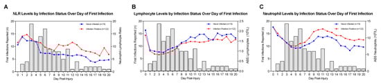 Figure 4A depicts density plots of new primary infections by day along with concur-rent NLR levels grouped by infection status. Here, daily NLR levels by infection status are overlaid by a frequency distribution of daily new infections reported. Days 3–6 had the highest numbers of new infections reported, although a minority still experienced their first infection during the end of the second week and throughout the third week post-TBI. Significant differences in NLR levels by infection status were noted on days 5–13 and 16–20, (p < 0.05 all comparisons). Visually, it appears that the highest rates of primary infections occur around day four, after which point, NLR levels start to separate by infection status. Interestingly, the infection positive group had higher NLR levels compared to the non-infected group. Figure 4B,C shows ABS lymphocytes and ABS neutrophils by infection status overlaid on the frequency distribution of new primary infections. Between days two and six, lymphocyte levels are slightly lower in the infected group compared to the group without infection (Figure 4B). Interestingly, Figure 4C shows a substantial separation in neutrophil levels between the no infection and infection sub-groups beyond day four and during the highest daily rates of new infections. ABS lymphocyte counts were lower in the infection group compared to the no infection group on days 5, 10–12, 16, and 19 (p < 0.05 all comparisons) (Figure 4B). ABS neutrophil counts were higher in the infection group compared to the no infection group on days 6, 8, 9, 15–17, and 20 (p < 0.05 all comparisons) (Figure 4C).