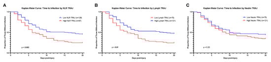Kaplan–Meier estimates suggest the time to first infection was significantly earlier for a larger proportion of the high NLR TRAJ compared to the low NLR TRAJ (p = 0.003) group as reflected by the greater decrease in proportion of individuals without infection in the high NLR TRAJ (red) over time when compared to the low NLR TRAJ (blue) group (Figure 5A). Consistent with lower daily infection rates, noted in Figure 4, the proportion of new individuals acquiring infections declined among individuals in both TRAJ groups after day 10 post-TBI. Kaplan–Meier estimates of time to first infection were also generated by ABS neutrophil and ABS lymphocyte TRAJ groups. The proportion of individuals without infection was lower over time in the low ABS lymphocyte TRAJ group (p = 0.01) (Figure 5B). In contrast, there were no significant differences in time to infection between ABS neutrophil TRAJ groups (p = 0.20) (Figure 5C). Given the high degree of concordance between both ABS neutrophil and ABS lymphocyte TRAJ groups to NLR TRAJ groups, these results suggest that ABS lymphocyte counts, not ABS neutrophils, are likely responsible for the NLR TRAJ differences in time to infection, noted in Figure 5A.