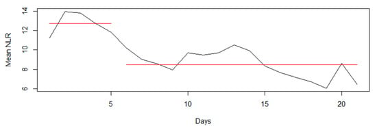 We explored the optimal changepoint for NLR TRAJ groups over time and generated regression models for time-to-infection and NLR over two distinct time intervals. Our changepoint analysis of the mean NLR trend over time estimated that the distribution of NLR was different before and after day five (Figure 6). This finding was also supported by Figure 4B,C, wherein both ABS lymphocytes and ABS neutrophils began to rise again by days five and six, respectively, after an initial decline.