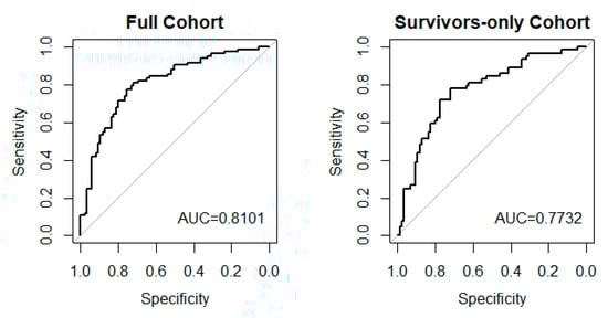 ROC Plots for Unfavorable GOS Using the Full and Acute-Survivors-Only Cohorts.
