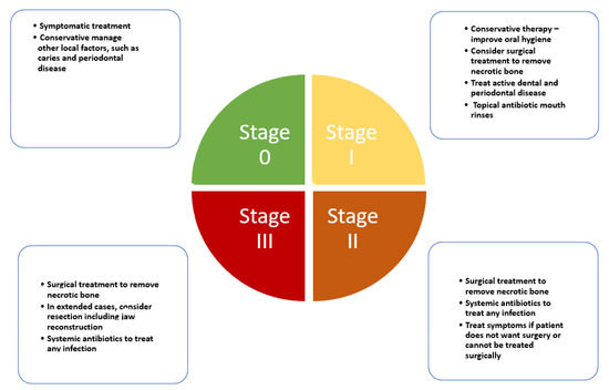 One of the most important issues in the development of a staging system for MRONJ is to aid in the selection of appropriate treatment and foresee a prognosis. The establishment of globally accepted criteria for the management of patients is imperative to achieve proper treatment approaches. However, from the introduction of the initial introduction by Ruggiero et al. [96], new staging systems have been constantly introduced jeopardizing the body of literature produced year after year in terms of longitudinal studies [97]. In this section, we report and discuss the most current accepted and up-to-date staging system to achieve consensus [20] (Figure 1). Therefore, current treatment strategies for MRONJ have been constructed based on clinical aspects rather than scientific evidence. The treatment strategy for MRONJ at each stage is introduced based on several position papers, and other studies including systematic reviews and consensus statements [20,21,23,30,82].