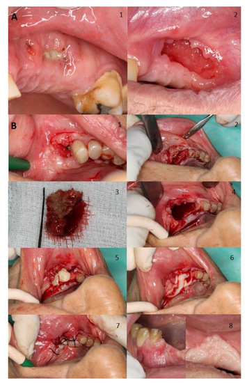 (A) Man aged 77 years with prostate cancer without symptomatology developed stage I MRONJ in his left maxilla with bone exposure after receiving zoledronate for suspected bone metastases. Image 1 relates to initial presentation, whilst the second one shows the outcome of treatment with antibiotics and chlorhexidine treatment for 2 months; bone gradually sequestered over time and the soft tissue as the soft tissue eventually closed. (B) Woman aged 81 years with osteoporosis who developed stage II MRONJ with bone exposure in her left mandible with severe pain. The patient was initially treated with risedronate but was eventually switched to denosumab. Triggers of necrosis were mainly severe chronic periodontal disease and a dental extraction (Image 1). Initially we performed an incision and flap elevation to visualize affected area (Image 2). Then resection of necrotic bone was performed (Images 3 and 4). Then, an application of L-PRF by Choukroun’s method was performed and primary wound closure was achieved (Image 5, 6, and 7). A month after treatment total resolution was achieved (Image 8).