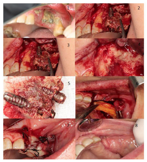 Woman aged 81 years with osteoporosis treat with alendronate. The patient developed stage 3 MRONJ with large areas of bone exposure and pus exudation on the left maxilla plus a chronic oroantral fistula on the left maxillary sinus. The patient experienced severe pain and had severe signs of infection. The trigger factor was dental implants placement (Image 1). Initially, we performed an incision and flap elevation to visualize the affected area (Image 2). Then, two extractions were performed due to the poor dental prognosis, implant extraction, and resection of necrotic bone was also performed (Images 3–5). To close the oroantral fistula, an intraoral bichectomy was performed to harvest tissue. Obtained tissue was placed in the resection area and primary wound closure was achieved (Images 6 and 7). Two months after treatment, total resolution was achieved (Image 8).