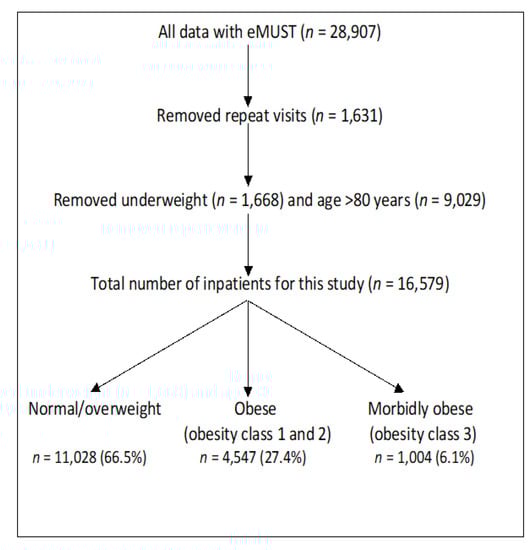 The data included details of 28,907 inpatients who had an eMUST performed during hospital admission. After removal of the second and subsequent visits for any patient (n = 1631), underweight patients (BMI < 18.5 kg/m2) (n = 1668), and those over the age of 80 years (n = 9029), 16,579 patients were available for inclusion in this study (Figure 1). When characterised according to the BMI, 34.6% of these patients had a normal BMI, 31.9% were overweight, 18.9% were in obese class 1, 8.5% in obese class 2 and 6.1% were morbidly obese (Table 1). For this study, we compared the clinical characteristics and outcomes between 3 groups: normal/overweight patients n = 11,028 (66.5%), obese patients (obesity class 1 and 2) n = 4547 (27.4%) and the morbidly obese group n = 1004 (6.1%).