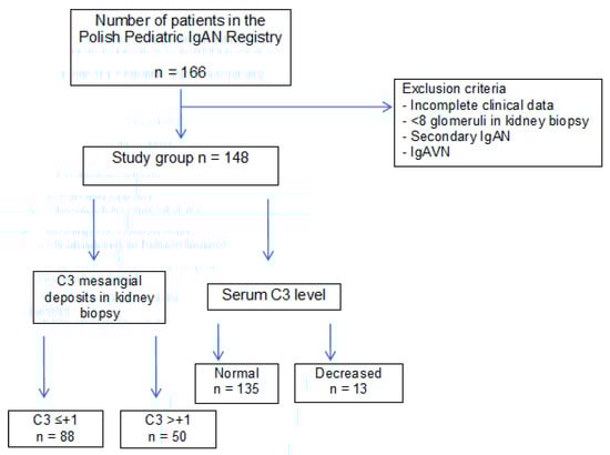 The study included 148 children (91 boys and 56 girls) from the 166 patients included in the Polish Pediatric IgAN Registry. The patients included in the study fulfilled the following inclusion criteria: IgAN diagnosed based on kidney biopsy with evaluation by light microscopy and immunofluorescence. Patients without complete clinical and histopathological data, with the glomerular number < 8, with secondary IgAN and IgA vasculitis nephritis (IgAVN, Henoch-Schönlein nephritis) were excluded from the study.