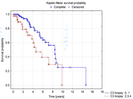 In the study by Caliskan et al. in 111 adult patients with IgAN, C3 deposits > +1 were found to be a prognostic factor for the development of chronic kidney disease (CKD) stage G5 or reduction in GFR by ≥50% compared to the baseline [].