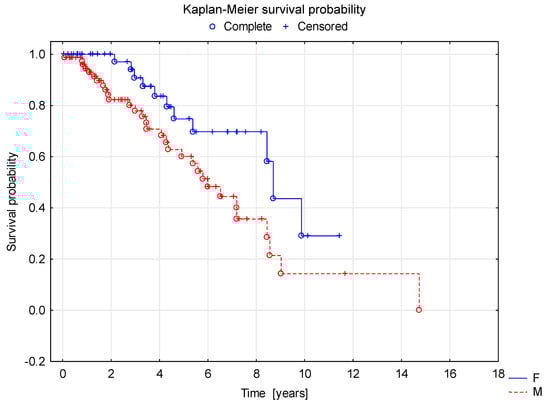Survival curve analysis using the Cox proportional hazard model showed a shorter duration of renal survival with normal GFR in children in group B (C3 >1 in kidney biopsy) compared to group A (C3 ≤ 1) (Figure 2). In the survival curve analysis, factors affecting longer renal survival with normal GFR included female gender (F > M, Figure 3), older age at the diagnosis and normal GFR at the onset of the disease (Figure 4).