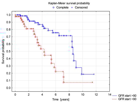 Shorter renal survival with normal GFR in patients with reduced GFR (<90 mL/min) at the time of the diagnosis.