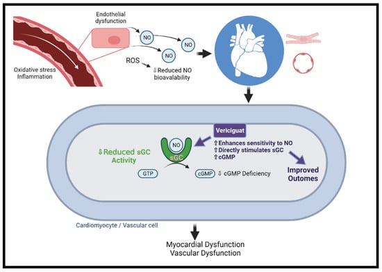 The nitric oxide (NO)–cyclic guanosine monophosphate (cGMP) pathway plays a key role in the regulation of the CV system [70,71]. NO mainly regulates cardiac function by activating soluble guanylate cyclase (sGC), which catalyzes the formation of cGMP, resulting in protein kinase G (PKG) activation [70,72]. PKG modulates cardiac and vascular muscle contraction and energy consumption by decreasing intracellular calcium concentration and myosin light chain activity [73]. The phosphodiesterase (PDE) enzyme family members hydrolyze cGMP, negatively regulating the signaling pathway [74]. The downregulation of the pathway exerts deleterious CV effects, including vascular dysfunction, hypertension, fibrosis, adverse cardiac remodeling, and ultimately the development of HFrEF or HFpEF [70,75,76,77].