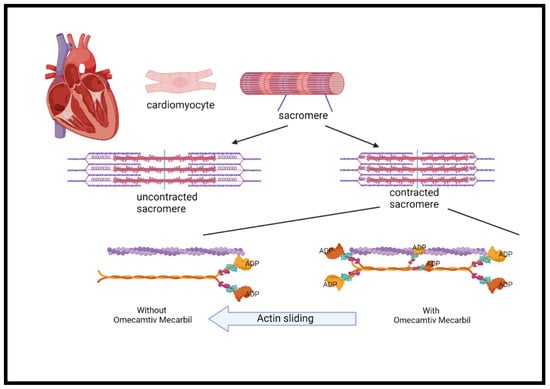Omecamtiv mecarbil, formerly known as CK-1827452, was the first agent developed to accelerate the transition of the actin–myosin complex from weakly bound to a firmly bound configuration (Figure 3) [90,91,92]. Omecamtiv mecarbil was found to improve cardiac function in patients with HFrEF. However, higher infused doses have led to cardiac ischemia in some cases [92,93]. Safety and tolerability were tested and found not to be different from placebo, including time to angina, exercise duration, or ischemic ECG changes [94].