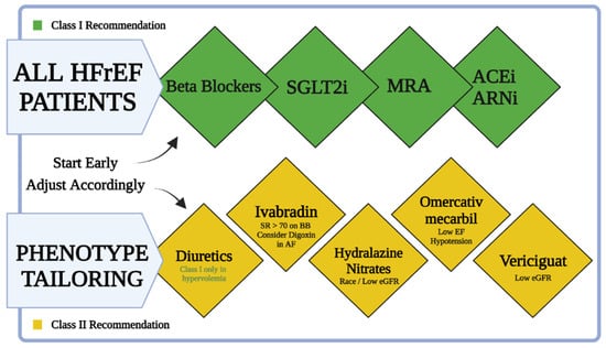 Based on a large series of clinical trials, it appears that SGLT2i have the largest effect, hence they have become a class I recommendation in the recent ESC guidelines for chronic HFrEF. Omecamtiv mecarbil and vericiguat have provided less striking results, probably directing their clinical use to specific clinical scenarios, such as omecamtiv mecarbil’s use for patients with lower systolic blood pressure. The future holds tremendous and exciting pharmacologic avenues to be explored. The role of inflammation in morbidity and mortality outcomes in HF patients is a primary area of interest. Genetic analysis of HF patients might shed light on the variation in responses to specific medications, and personalized therapeutic regimens may be suited accordingly. Alongside the tremendous developments described in this manuscript, the rate of patients receiving guideline-directed medical therapy is still low [100]. Therefore, increasing efforts to improve adherence to optimal medical therapy for HFrEF patients is mandatory to achieve maximal clinical benefits.