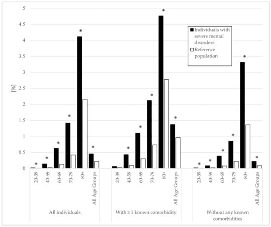 Distribution of age and comorbidities in patients with severe mental disorders vs. reference population.