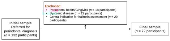 From an initial sample of 132 patients referred for periodontal diagnosis, 60 participants were excluded when inclusion and exclusion criteria were applied (Figure 1).