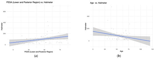 We then assessed which variables were associated with the measurement of VSCs both in the overall sample and in a sample of patients clinically diagnosed with halitosis (Table 4). Considering all patients, our stepwise linear regression pointed to the PESA of the posterior-lower region (B = 1.3, 95% CI: 0.2–2.3, p = 0.026) and age (B = −1.6, 95% CI: −3.1–0.2, p = 0.026) as the most significant variables. As with halitosis patients, the PESA of the posterior-lower region (B = 0.1, 95% CI: 0.0–0.1, p = 0.001), PISA Total (B = −0.1, 95% CI: −0.1—0.0, p = 0.008) and the OHIP-14 domain of physical disability (B = −2.1, 95% CI: −4.1—0.1, p = 0.040) were the most significant variables within this model. A graphical representation of PESA posterior-lower teeth and age towards the measurement of VSCs was made (Figure 2).