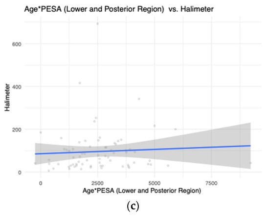 Graphical representation of PESA posterior-lower teeth and age towards the measurement of VSCs. (a) PESA (Lower and Posterior Region) vs Halimeter; (b) Age vs Halimeter; (c) Age*PESA (Lower and Posterior Region) vs Halimeter.