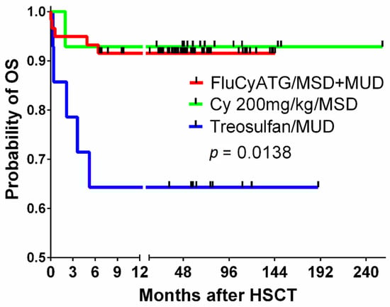 Severe aplastic anemia (SAA) is a rare but life-threatening hematological disorder with an extremely high risk of fatal infectious complications. The hallmark of SAA is pancytopenia caused by bone marrow (BM) hypoplasia or aplasia as a consequence of direct damage by chemical or physical factors or constitutional or acquired genetic defects, e.g., Fanconi anemia, or telomere biology disorders [1,2,3]. In the majority of SAA patients, the cause cannot be directly identified, but immune-mediated destruction of BM hematopoiesis is the most likely culprit. Autoimmunity can be triggered by alterations in antigens modified by drugs, chemical agents or viral infections and, consequently, can lead to the activation of the immunological cascade and damage to BM cells via activated T lymphocytes [2,4,5,6]. Allogeneic hematopoietic cell transplantation (HCT) from HLA-identical matched sibling donors (MSDs) is the method of choice for the treatment of SAA in children. Patients without sibling donors undergo immunosuppressive (IS) therapy or HCT from matched unrelated donors (MUDs) [6,7,8,9]. In the last 20 years, different protocols have been used in clinical practice in our center, and, at that time, in Polish children with SAA, MSD and MUD HCT were associated with a 5-year probability overall survival of 91 and 64%, respectively [10]. Treosulfan-based conditioning before MUD HCT was associated with 35% treatment-related mortality (Figure 1), and a decision was reached to introduce a combination of fludarabine, cyclophosphamide and antithymocyte globulin (FluCyATG). It must be mentioned here that patients who underwent transplantation after treosulfan had a median time of 19 months from diagnosis and a longer prior history of blood transfusions. The aim of this study was to evaluate the outcome of a conditioning protocol, FluCyATG, in children undergoing transplantation for SAA.