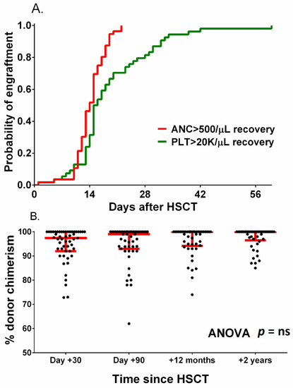 Probability of neutrophil and platelet engraftment (A) and donor chimerism after HCT (B). Red lines in figure (B) represent the median with interquartile range.