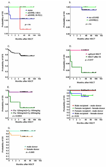 The cumulative incidence of acute GVHD (A) and chronic GVHD (B) and the probability of graft-free survival (C) after HSCT. The impact of pretransplantation immunosuppressive therapy (IS) (D) and the intensity of the chemotherapy protocol (E) on the probability of OS. The role of recipient and donor genders (F) and of donor genders (G). Legend. OS, overall survival; GFS, graft versus host disease-free survival; HSCT, Allogeneic hematopoietic cell transplantation; Flu, fludarabine; Cy, cyclophosphamide; GVHD, graft versus host disease; aGVHD, acute graft versus host disease; cGVHD, chronic graft versus host disease.
