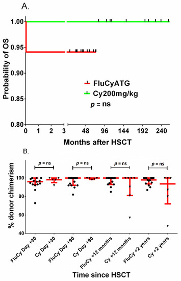 In addition, the probability of OS was analyzed in the two subgroups: 18 patients received transplants from MSDs after FluCyATG and a historic group of 13 patients received transplants from MSDs after cyclophosphamide 200 mg/kg BW with or without ATG; the probability of 5-year OS was 94.1 and 100%, respectively, but the difference was not statistically significant (Figure 4A). The percentage of donor chimerism between these two groups was not significantly different 1, 3, 12 and 24 months after HCT (Figure 4B).