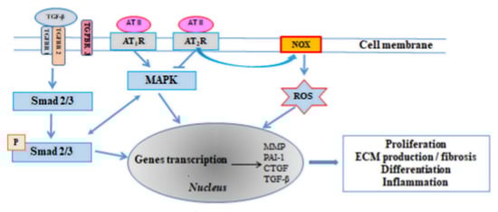 Besides fibroblast activation and collagen synthesis, TGF-β can also induce cardiomyocyte apoptosis []. It should be also stressed that angiotensin II cannot cause cardiac hypertrophy and fibrosis in absence of TGF-β, but can induce TGF-β synthesis, Smad 2/3 phosphorylation and Smad complex translocation into the cell nucleus and can increase active Smad 2/3 binding to DNA (Figure 1). TGF-β can also directly stimulate the expression of type 1 angiotensin II receptor []. Angiotensin II predisposes also to fibrosis through promoting of expression of profibrotic factors such as endothelin-1. Moreover, angiotensin II, combined with aldosterone, promotes oxidative stress (i.e., excessive ROS production) and inflammatory condition, mainly through NADPH oxidase activation [,].