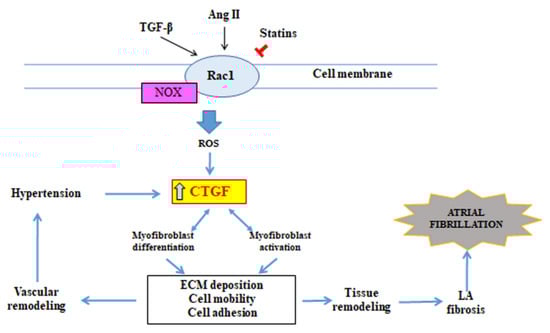 In view of the fact that Rac 1 requires modification after translation through isoprenylation for normal functioning, it can be potentially inhibited by 3-hydroxy-3-methyl-glutaryl-coenzyme A reductase inhibitors, which block the synthesis of isoprenoids []. Indeed, statins inhibit the angiotensin II-induced, NADPH oxidase-dependent myocardial oxidative stress and heart remodelling [,]. Furthermore, the treatment with statins is associated with a reduced incidence of AF development in postoperative patients [].
