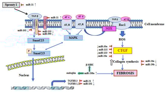 Modulation of signalling pathways by miRNAs in the pathogenesis of atrial fibrosis. ↑ up regulation of miR; ↓ down regulation of miR; ⟙ (red arrow) inhibition; → (green arrow) activation. miR—microRNA; β-MHC—β-myosin heavy chain; Sprouty 1—protein Sprouty homolog 1.