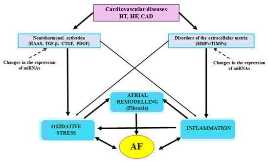 Possible association of atrial fibrillation with atrial remodelling, inflammation and oxidative stress. ⤏ modulation of the expression; → activation of the expression. AF—atrial fibrillation; CAD—coronary artery disease; HF—heart failure; HT—hypertension; PDGF—platelet-derived growth factor; RAAS—renin-angiotensin-aldosterone system; TIMP—tissue inhibitor of metalloproteinase.