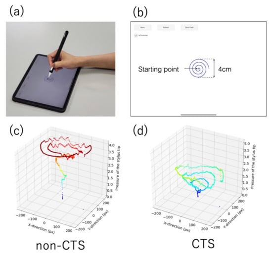 (a) A participant using the stylus on the app installed on the tablet. (b) The app screen. Participants drew a spiral along the blue guide spiral. The longitudinal diameter of the guide spiral was set to 4 cm to observe their manual dexterity. (c,d) are 3D graphs with the stylus trajectory on the xy-plane and the pressure of the stylus tip on the vertical axis drawn by non-CTS and CTS participants, respectively.