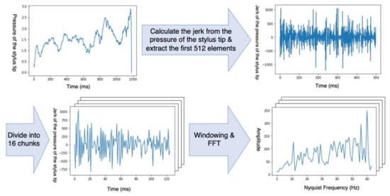 We calculated the jerk from the time-series data of pressure of the stylus tip and extracted the first 512 elements, then applied the Hanning window function and fast Fourier transform (FFT). Finally, the Nyquist frequency, which is half of the sampling frequency, was used as training data.