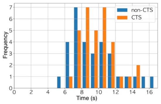 Firstly, we calculated the jerk from the trajectory and that from the pressure of the stylus tip for each participant. This was because the velocity of the stylus movement and the pressure of the stylus tip differed among the participants. The sampling frequency was 120 Hz. The first 512 frames were extracted from each jerk due to the following two reasons: The first was to enable a classification independent of the time used to draw the spiral—all the participants used more than 5 s to complete the drawing; therefore, we obtained data on a duration less than 5 s for any participants (Figure 3). The second reason was to ensure a quick computation of the fast Fourier transform (FFT) described below when the number of data points is a power of two []. We divided the 512 frames into 16 chunks; thus, each chunk consisted of data from 32 frames. Finally, we obtained the frequency components by applying the Hanning window function and FFT to each chunk. Each chunk was converted into 32 frequency components. According to the Nyquist–Shannon sampling theorem, frequency components of up to 60 Hz, which was half of the sampling frequency, were used as the training data. At the end of the training, a 256-dimension dataset (16 chunks x 16 frequency components) was obtained for each participant.