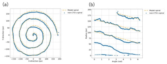 The section from the start of the spiral to 2π was excluded from the observation area. This was because when the participants started drawing from a position off the starting point, noise was generated (Figure 4b). We tried to eliminate this noise by using thresholds of θ and r, but this was difficult because the noise generated was different for each participant.