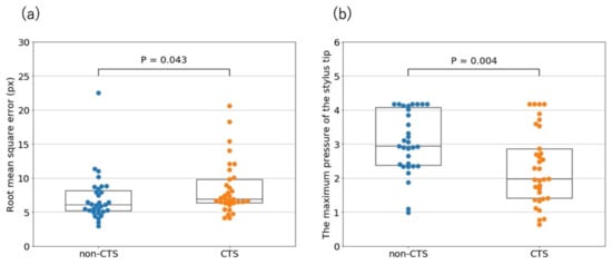 (a) Comparison of root mean square errors between the participants’ spirals and the model spiral in the non-CTS and CTS groups. (b) Comparison of the maximum pressures of the stylus tip between the non-CTS and CTS groups. There were significant differences between the non-CTS and CTS groups in each comparison.