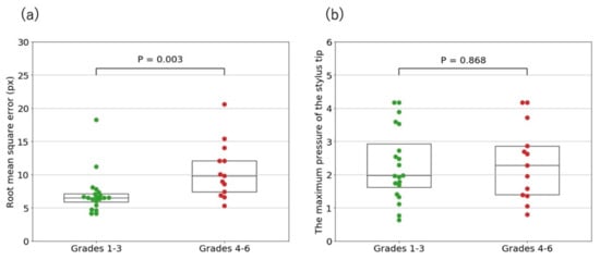 The CTS group was divided into two groups, patients with CTS grades 1–3 and those with CTS grades 4–6, based on the Bland classification. (a) Comparison of root mean square errors between the participants’ spirals and the model spiral in the patients with CTS grades 1–3 and those with CTS grades 4–6. There was a significant difference between the grades. (b) Comparison of the maximum pressures of the stylus tip between patients with CTS grades 1–3 and those with CTS grades 4–6.