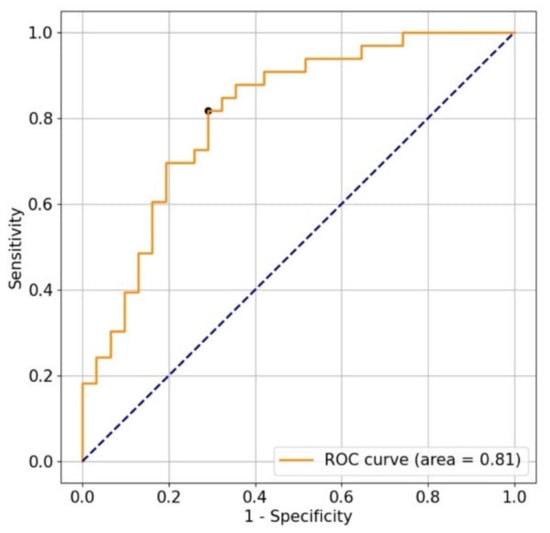 The receiver operating characteristic curve for classification using the jerk of the trajectory of the stylus tip. The sensitivity and specificity were 82% and 71%, respectively, when the cutoff was the black point closest to the upper left of the graph. The area under the curve was 0.81.