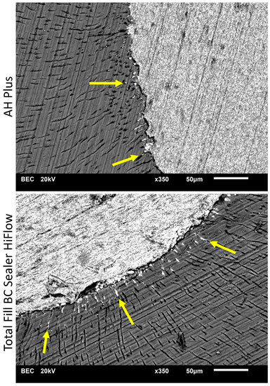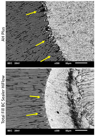 Scanning electron microscope (SEM) images display sealer penetration depth of AH Plus and Total Fill BC Sealer HiFlow after warm vertical root canal obturation at 2 mm from the root apex. Arrows indicating the sealer penetration depth found in SEM images.