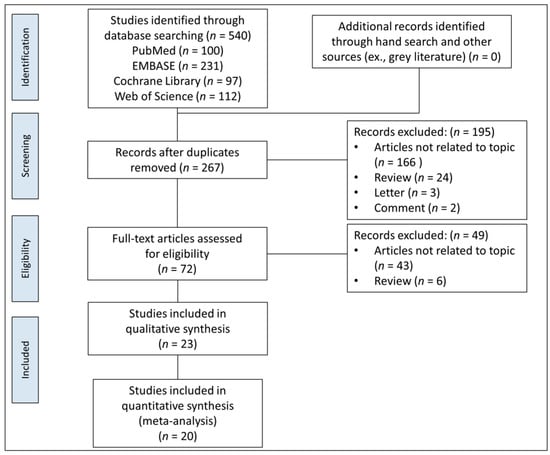 After searching four electronic databases and relevant bibliographies, 540 articles were obtained, after which, 267 unduplicated studies were screened for titles and abstracts, and 195 articles were discarded. We reviewed the full texts of the remaining 72 articles, and 49 were excluded according to the predetermined criteria (Figure 1). Finally, 23 studies were eligible for qualitative synthesis, and 20 were selected for quantitative analysis.