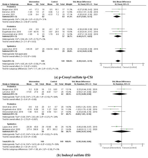 Forest plot for probiotic, prebiotic, and synbiotic effects on (a) p-cresyl sulfate (p-CS) and (b) indoxyl sulfate (IS) in hemodialysis patients.