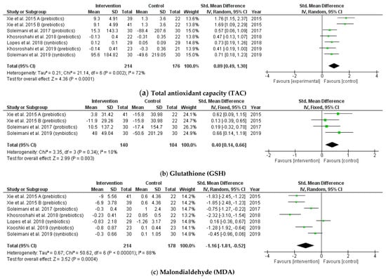 Forest plot for probiotic, prebiotic, and synbiotic effects on oxidative stress status: (a) total antioxidant capacity (TAC); (b) glutathion (GSH); (c) malondialdehyde (MDA) in hemodialysis patients.