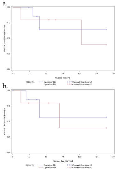 Kaplan–Meier estimator shows the overall survival (a) and the disease-free survival (b) for the patients with duodenal GIST and comparing LR and PD.