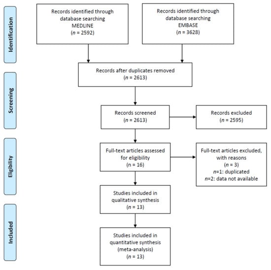 The literature search identified 2613 papers, after duplication removal. After abstract evaluations, 16 studies were considered for the full text analysis [32,33,34,35,36,37,38,39,40,41,42,43,44,45,46,47] (Figure 1). Three studies have been excluded, since one is a duplication of previously published results [45], and two works did not report the prevalence of neuropathy in NAFLD positive and negative patients [43,44] (Figure 1). Finally, 13 cross-sectional studies were included. No longitudinal trials were available on the topic. Table 1 summarizes the characteristics of 13 studies, finally included in the meta-analysis.