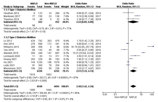 In order to reduce the high heterogeneity among studies (I2 = 97%, Figure 2), sensitivity analyses were conducted selecting those patients’ criteria that were significantly different between the study and control groups. Thus, sensitivity analyses were performed considering the patients’ BMI and diabetes duration. Moreover, since the diagnostic methods used to define DPN and NAFLD were variable between studies, further sensitivity analyses were performed considering these factors.