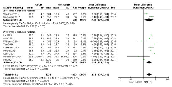 Forrest plot demonstrating the body mass index (BMI) comparing diabetic patients with and without NAFLD. Data are expressed as the mean difference and evaluated by applying the random effect model.