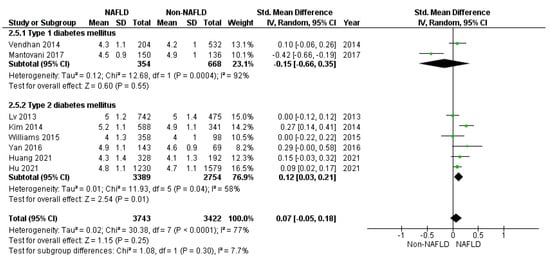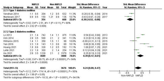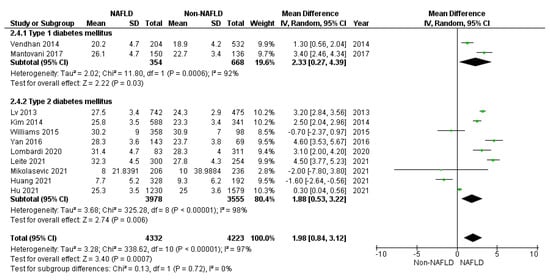 Considering diabetes duration and control, patients with NAFLD demonstrated no different HbA1c serum levels (p = 0.060) compared to controls (mean difference: 1.25, 95%CI: −0.07, 2.57), neither in T2DM (mean difference: 0.29, 95%CI: −0.58, 1.16, p = 0.510) nor in T1DM (mean difference: 6.49, 95%CI: −14.09, 27.07, p = 0.540); HbA1c serum levels were different between study and control groups. On the contrary, diabetes duration was significantly higher in the study than in control groups (p < 0.001), also considering T2DM (p = 0.006) and T1DM (p = 0.030) alone (Figure 4).